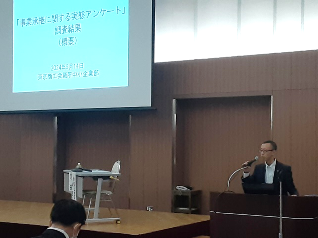 東京商工会議所からは、中小企業部より事業承継アンケート結果にもとづく23区内の事業承継への対応状況について説明し、その後ビジネスサポートデスク東京南より事業承継を中心とした活用できる経営支援サービスについて説明を行った。