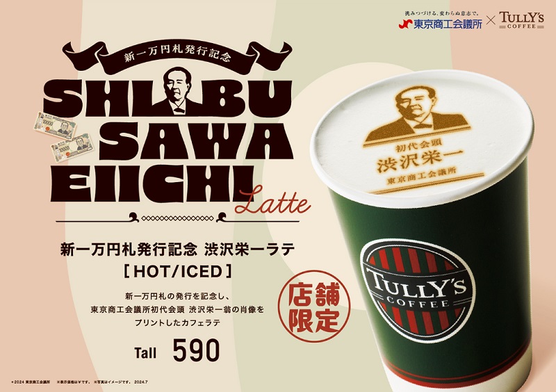 加えて、6月19日(水)から、タリーズコーヒー 東京商工会議所ビル店とコラボレーションし、初めて、渋沢翁の肖像を描いたカフェラテ「新一万円札発行記念 渋沢栄一ラテ」を期間限定で販売します。(店舗限定)
