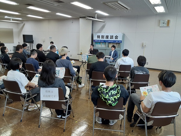 本座談会は、2021年11月に同校と締結した連携協定に基づき開催している事業で、昨年度に続き5回目の開催となりました。当日は、社会福祉法人ひまわり福祉会・盛山由佳理事長、東邦マーク(株)・竹岡慎一社長(いずれも当支部評議員)にご登壇いただき、同校の生徒25名を対象に、働く楽しさや大変さ、ともに働きたい人材等についてお話しいただきました。聴講した生徒からは、「社長になるためにはどうしたらよいのか」や「面接時にどのような質問をすると好印象なのか」など様々な質問が上がり、活発な座談会となりました。