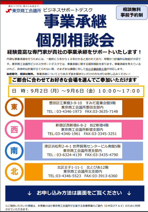 東京商工会議所ビジネスサポートデスクでは、事業承継に関する個別相談を承ります。今回の相談会はビジネスサポートデスク東西南北4拠点で同日開催します。
