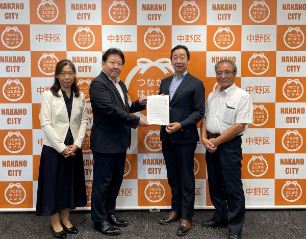 東京商工会議所中野支部(会長=正村宏人(株)東京アスレティッククラブ 代表取締役社長)と中野工業産業協会(会長=宮島茂明 宮島物産(株) 代表取締役会長)は9月2日に酒井直人・中野区長、8月27日に酒井たくや・中野区議会議長へ地域活性化のための提言をまとめた「中野区の産業活性化に関する要望」を提出しました。