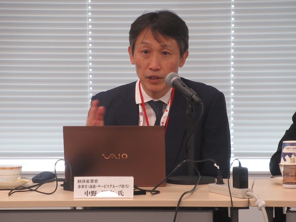 冒頭の宮入委員長(株式会社宮入社長)のご挨拶に続き、経済産業省 参事官(商務・サービスグループ担当) 中野 剛志 氏より、「流通・サービス業における政策動向について」と題して、構造的な人手不足などの日本のマクロ環境の変化について触れた後、物価高における流通業のあり方検討会及び改正物流効率化法の概要と、今後の政府の動向についてご講演いただきました。