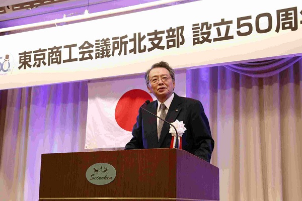 東京商工会議所北支部(越野充博会長・越野建設社長)は11月6日(水)、上野精養軒にて北支部設立50周年記念式典・祝賀パーティーを開催。会員企業をはじめ、北区や区内関係団体など176人が集まりました。