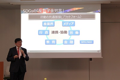 「特別講演会」では、ESGやSDGsに対応した企業ブランディングのコンサルタントとして活躍中の笹谷秀光氏を迎え、企業経営にSDGsを実装させる具体的な手法についてご講演いただきました。