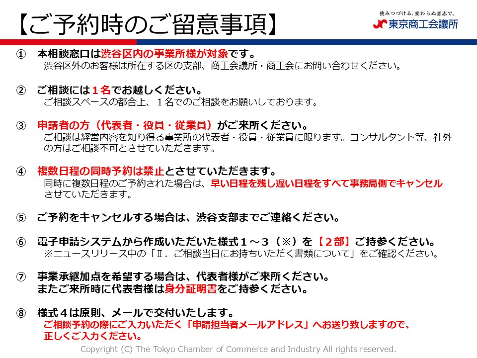 東京商工会議所渋谷支部では、渋谷区内の事業所を対象に、小規模事業者持続化補助金の相談窓口を下記のとおり設置いたします。ご予約にあたっては、下記のご案内についてご了承をいただいた上で、【末尾のリンク】よりご予約いただきますようお願いいたします(ご予約いただいた方は、ご了承いただいたものとみなします)。