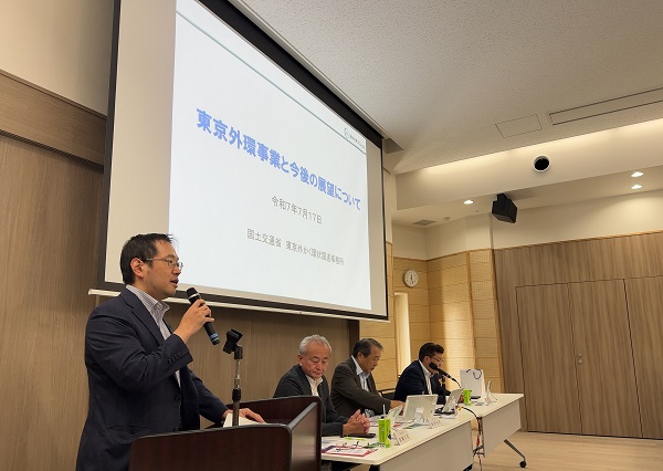 冒頭、飯野会長の挨拶に続き、金森 滋 氏(国土交通省 東京外かく環状国道事務所 事務所長)より「東京外環事業と今後の展望について」と題してご講演をいただきました。
