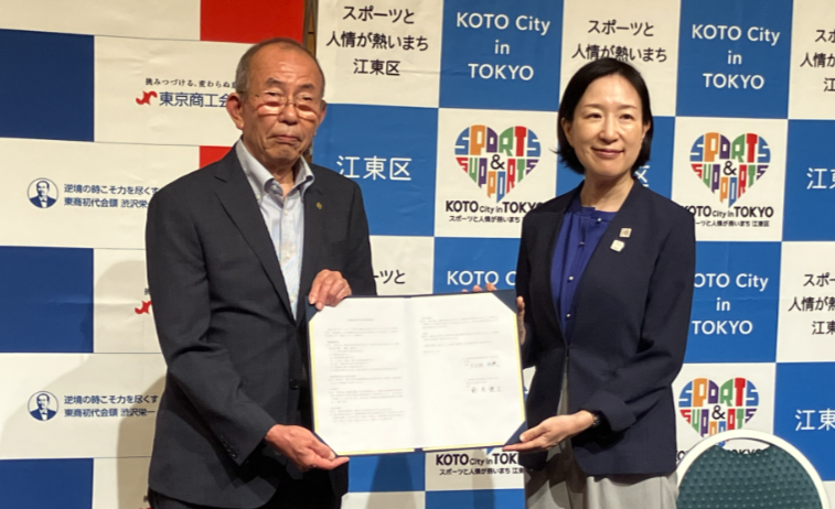 最後に、江東区と産業振興に関する包括連携協定を締結しました。本協定は、当支部と江東区が相互に協力し、産業振興によって社会課題の解決を図る取組を実践することを目的とした包括的な連携協定です。これまでも、当支部と江東区では創業支援・事業承継支援などの産業振興に向けて連携してきましたが、今後はこの協定に基づき、各機関が持つそれぞれの特徴を活かしながら、各種事業を一層緊密に連携し、推進してまいります。