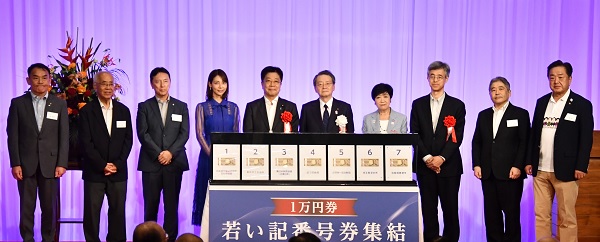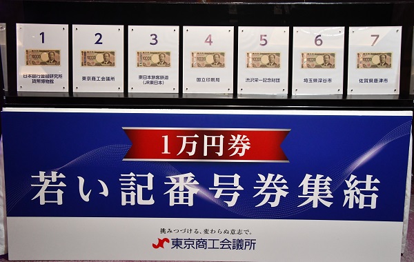式典では、昨年7月の新札発行時に、日本銀行から一万円券の肖像・デザインにゆかりのある企業・団体等に贈呈された若い記番号の一万円券を初めて集結させました。