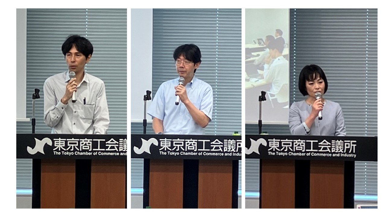 講演会では、東京都より3名をお招きしました。最初に、東京都 環境局 気候変動対策部 温暖化対策報告書担当課長 秋田 直宏 氏より「地球温暖化対策報告書制度について」、続いて東京都 産業労働局 産業・エネルギー政策部 事業者エネルギー推進課長 石島 英樹 氏より「東京都の省エネ・再エネ支援策 ~中小規模事業所等が活用できる助成事業~」、さらに東京都 産業労働局 産業・エネルギー政策部 産業政策連携促進担当課長 陣内 惠子 氏より「都内事業者向けHTT実践推進ナビゲーター事業について」ご講話いただきました。