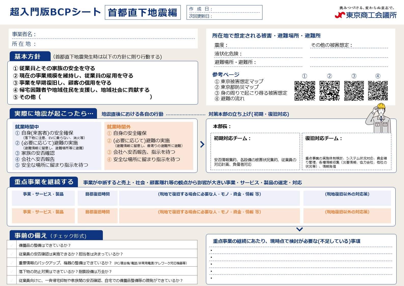 東京商工会議所(小林健会頭)は、災害・リスク対策委員会において、中小企業の皆様が手軽に、かつ実践的にBCPを作成できるよう、「超入門版BCPシート(首都直下地震編)」を公開しましたので、お知らせします。