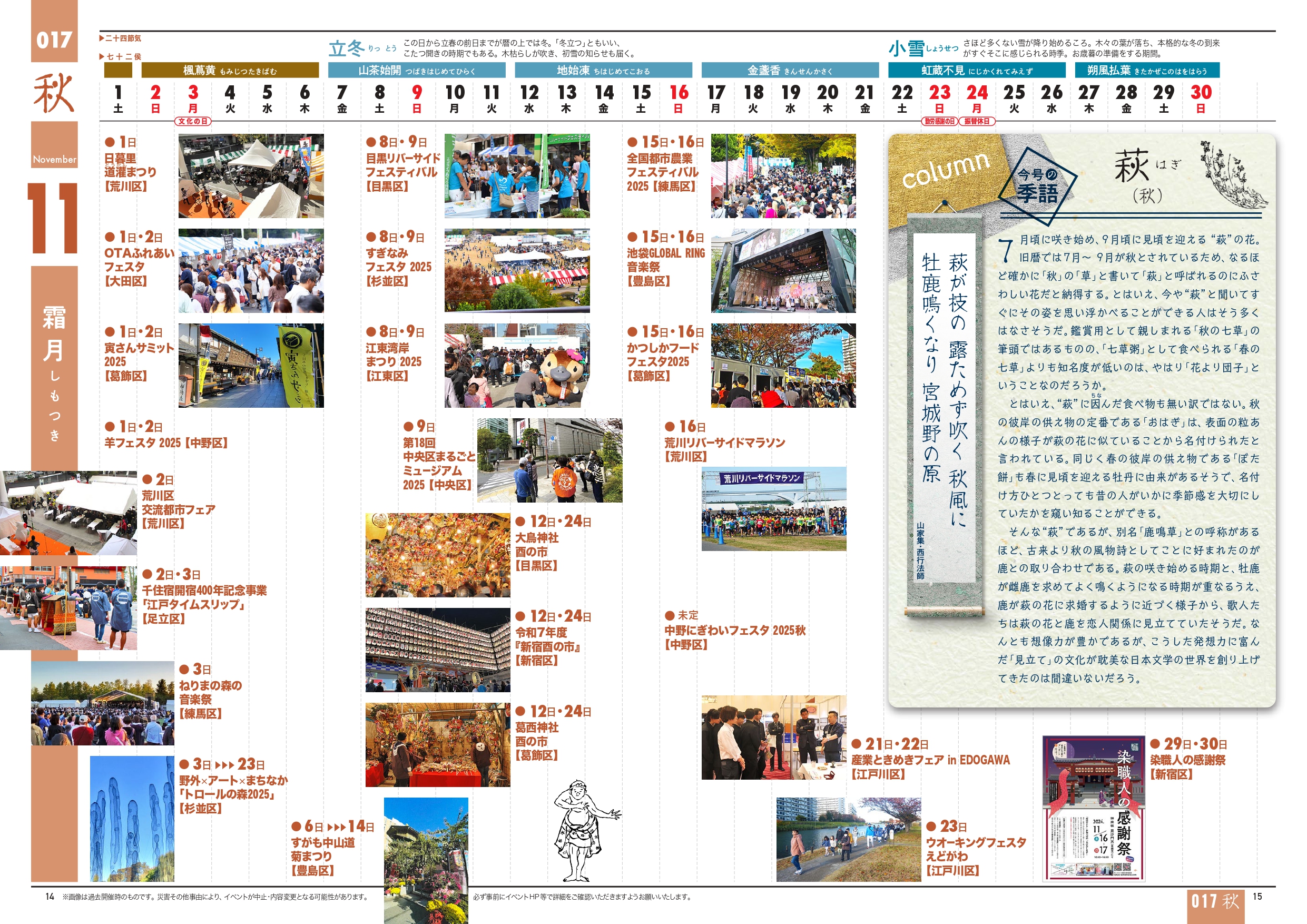 今号では「東京の秋」をテーマに、東京23区の観光協会・区役所等協力のもと、9月~11月のイベント情報を中心に、秋を感じられる地域密着情報をお届けしています。
