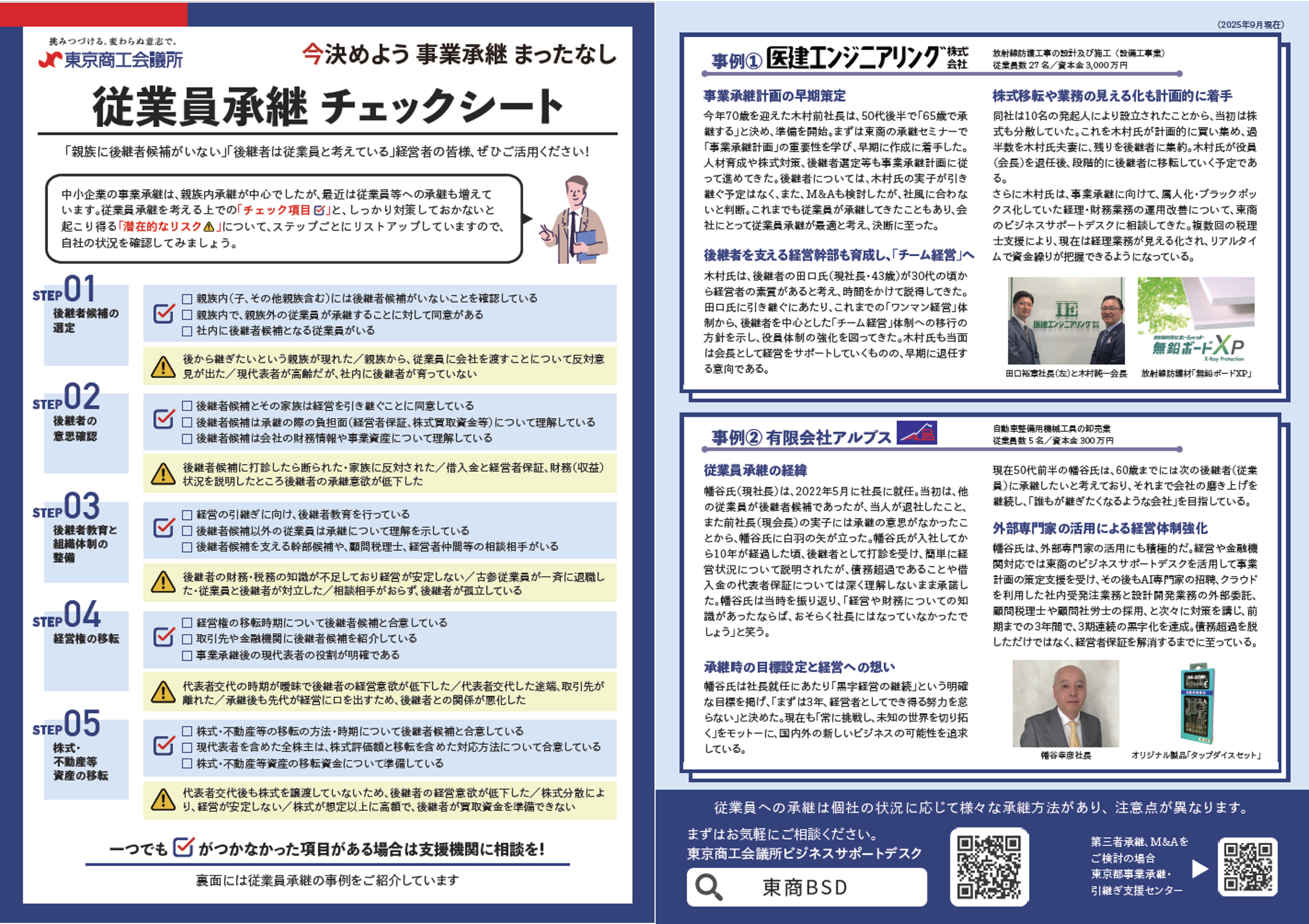こうした課題を踏まえて当所では、今回、従業員承継を検討する中小企業の経営者自身が、自社の準備状況を確認できるよう、本チェックシートを作成しました。表面に事業承継のステップごとに「チェック項目」と、事前に対策しておかないと起こり得る「潜在的なリスク」をまとめており、裏面には、従業員承継に関する2社の事例を掲載しています。