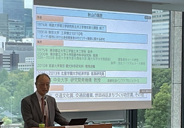 講演会では、中央大学 研究開発機構 機構教授 秋山哲男様より「人口減少・高齢化とデジタル社会における都市交通の課題」と題して、少子高齢化社会における都市交通の課題を踏まえた新たなモビリティの活用や官民連携の重要性についてご講話いただきました。
