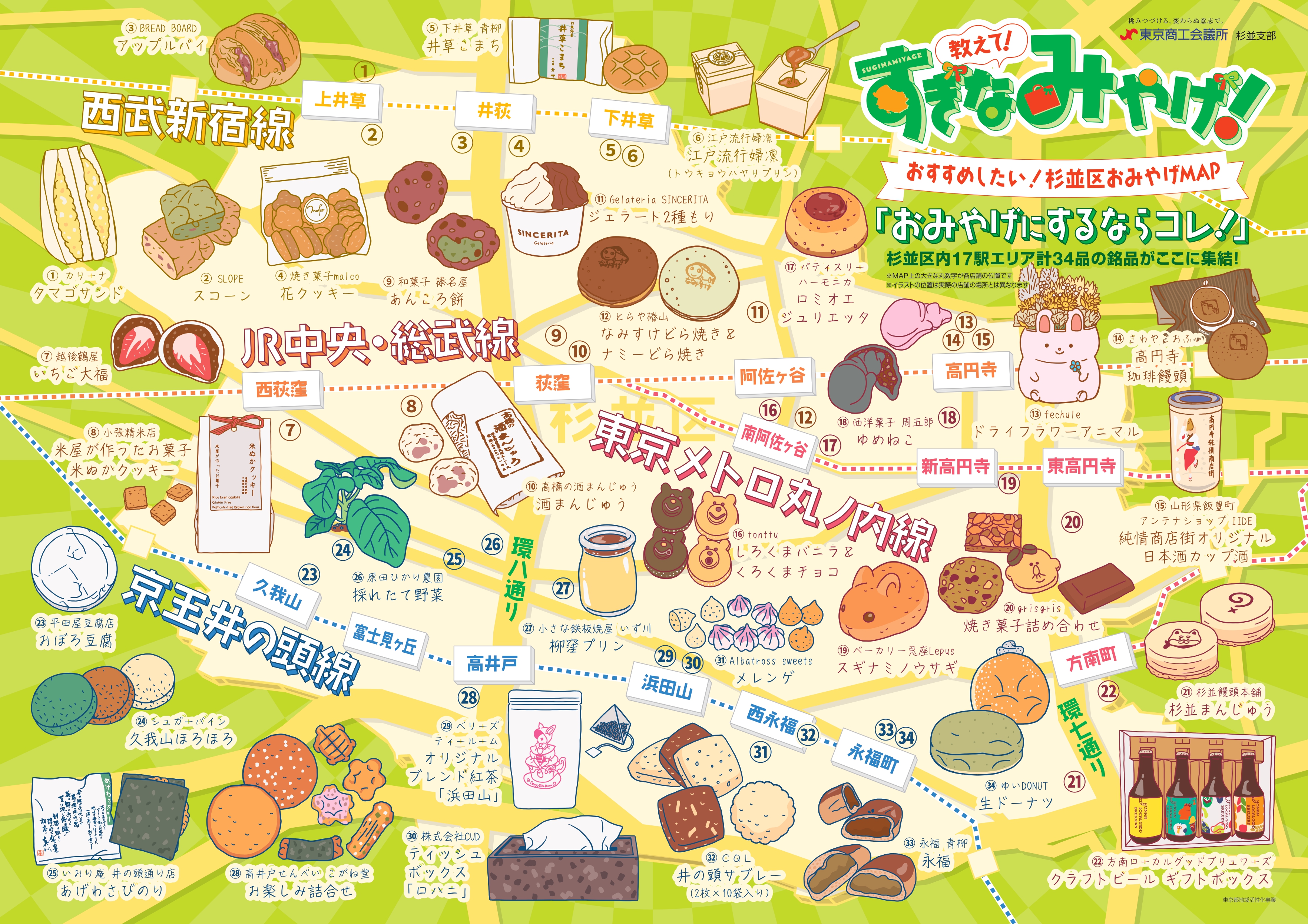 杉並支部(会長:和田新也・箱根植木㈱代表取締役社長)は、杉並区内のおすすめしたい銘品「すぎなみやげ」34品を選定し、選定した商品を掲載した「おみやげMAP」を作成しました。