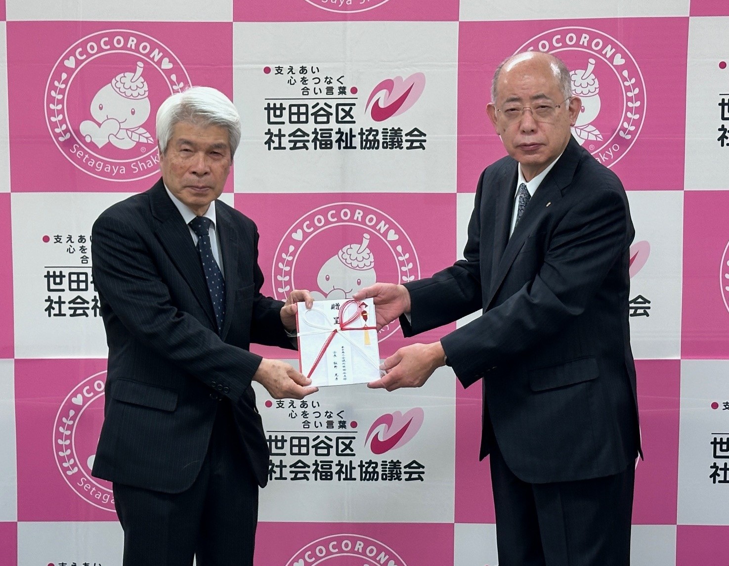 本バザーの売上金138,141円は大場信秀当支部名誉会長から世田谷区社会福祉協議会吉村俊雄会長へ寄贈しました。