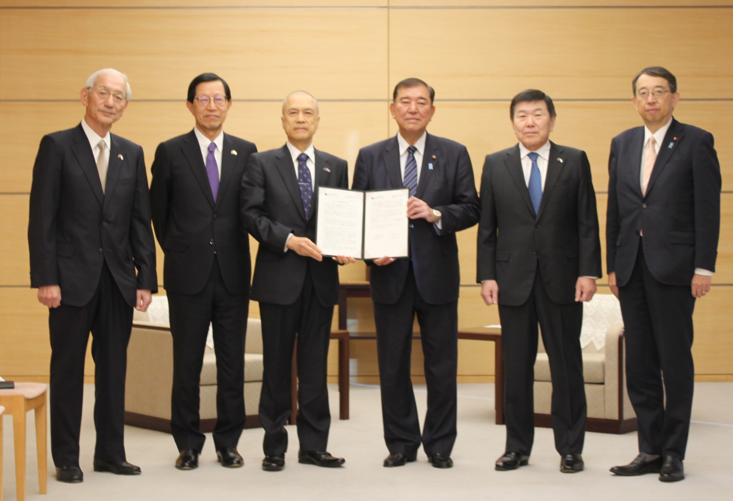 日豪経済委員会の広瀬道明 委員長(東京商工会議所副会頭、東京ガス相談役)、飯島彰己 副委員長(三井物産(株)顧問)、北村俊昭 副委員長((株)INPEX相談役)、進藤孝生 副委員長(日本製鉄(株)相談役)は、12月24日、首相官邸を訪れ、石破茂 首相に「第61回日豪経済会議」について報告をしました。