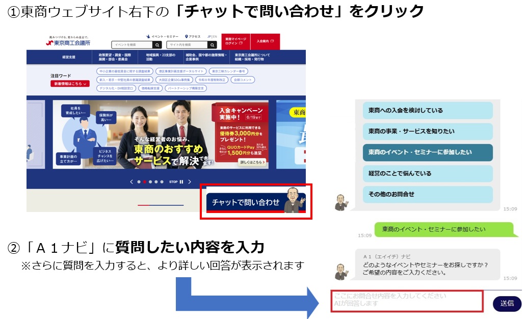 こうした課題を解決し、東商のサービス力を強化するために、東商の事業・サービスに関する様々な質問やお問い合わせに対応する総合案内役のAIチャットボットである「東商AIコンシェルジュ A1(エイイチ)ナビ」を、4月1日から東商ウェブサイトへ搭載いたしました。これにより、自社の課題・ニーズに合った東商の事業やサービスを、24時間いつでもご案内します。利用方法も簡単ですので、まずは「A1ナビ」をお試しください。