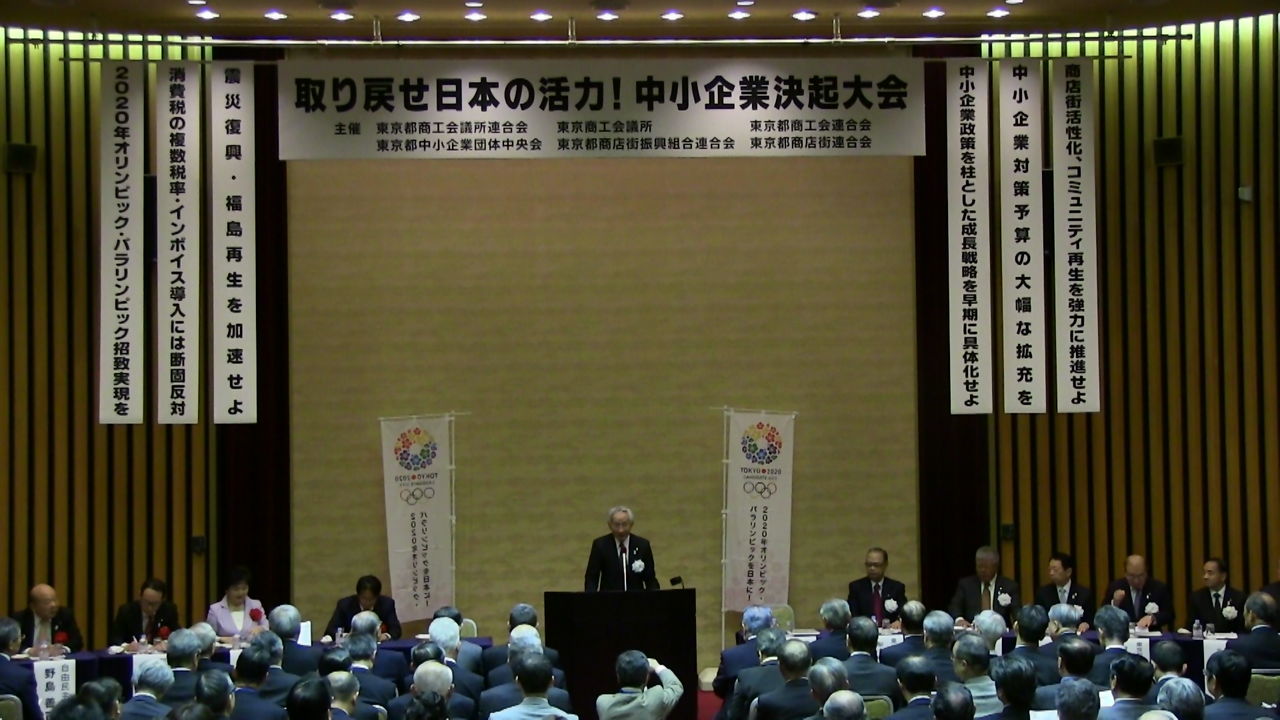東京商工会議所をはじめとする中小企業6団体(東京商工会議所、東京都商工会議所連合会、東京都商工会連合会、東京都中小企業団体中央会、東京都商店街振興組合連合会、東京都商店街連合会)は4月25日に、「取り戻せ日本の活力!中小企業決起大会}を開催し、493名が参加しました。