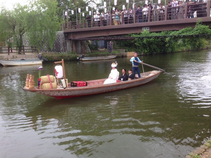 午前中はあやめ祭りが開催中の「潮来あやめ園」を訪れ、100万本のあやめが開花シーズンを迎える中、「嫁入り舟」などさまざまなイベントが行われる園内を見学しました。