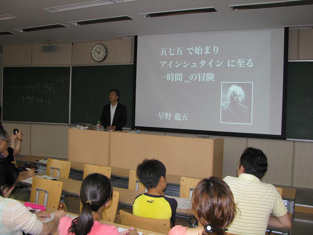 世界的な原子物理学者で近年は福島の原発事故に関する調査でも有名な研究者である早野龍五教授が、中学生に科学に親しんでもらえる内容で講義を進めていただき、今回は正確な時間の測定や暦が世界の発展に果たした役割や、宇宙の膨張、身近な携帯電話やカーナビに使用されているGPSに相対性理論が活用されていること等が取り上げられました。90分の講義の後には、早野教授に質問する列ができるなど、子どもも大人も興味深く話を聞いて、楽しい時間を過ごすことができました。