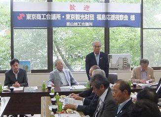 一行は、郡山商工会議所および郡山コンベンションビューローを訪問し、丹治一郎会頭や県幹部と意見交換しました。丹治会頭は挨拶で震災で被災した郡山商工会議所会館の建て替え計画について説明し、「『築こう元気な郡山』を合言葉に、市民一丸となって元気に頑張っている」と述べました。上條副会頭は「県内最大の経済圏であり交通の重要拠点でもある郡山のリーダーシップに大いに期待する」と述べるとともに継続的な支援を約束しました。担当者からは、風評被害払しょくに向けた「首都圏キャラバン事業」や、食・観光分野での安全・安心に関する施策の説明があったほか、積極的な誘致活動の結果、コンベンション開催件数が震災前の水準に回復したという報告がありました。