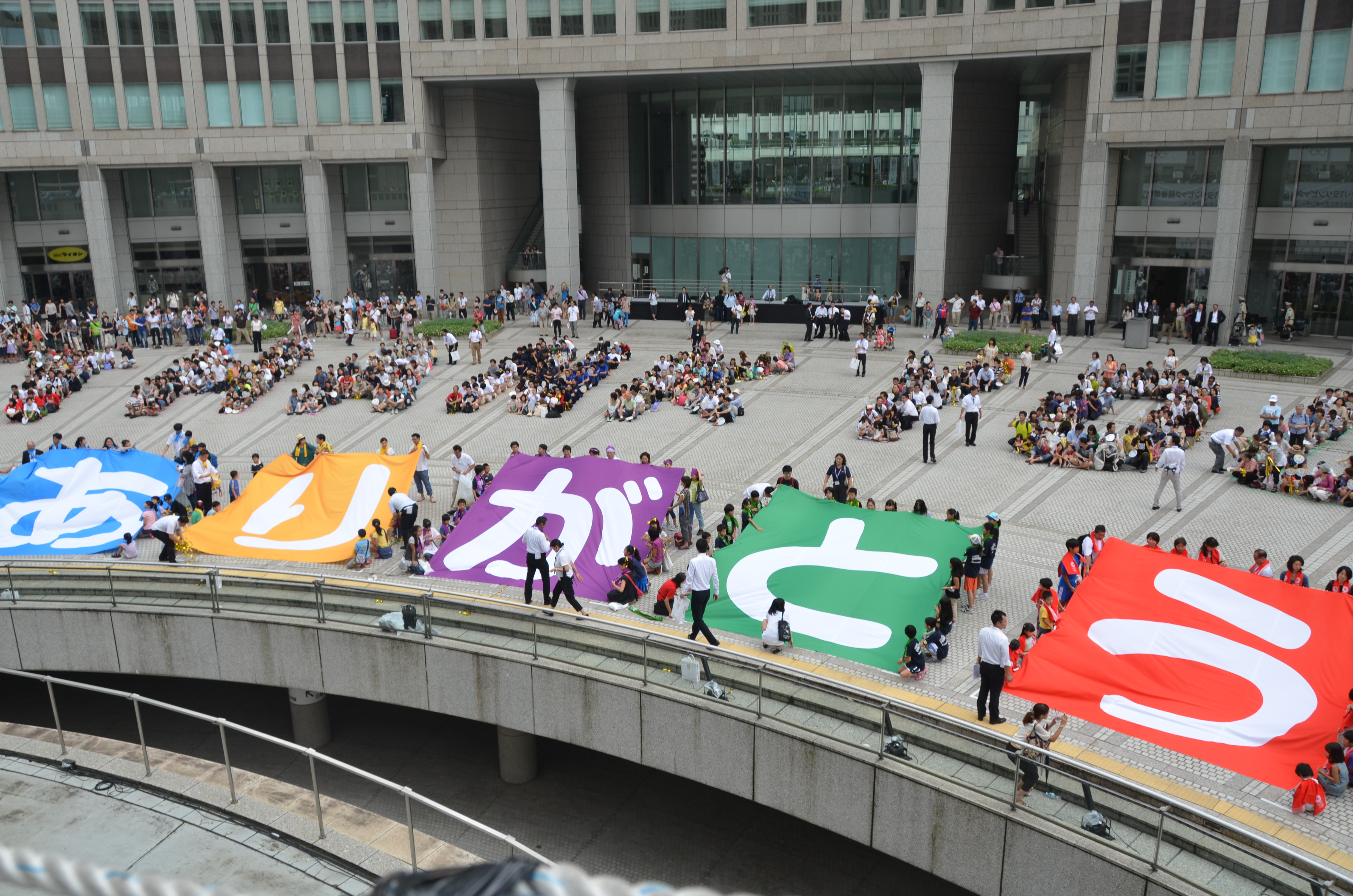 報告会では、東商の中村専務理事をはじめとした主催者挨拶が行われた後、集まった人たちが「THANK YOU」の人文字をつくり、国内外に向けて感謝の意を発信しました。