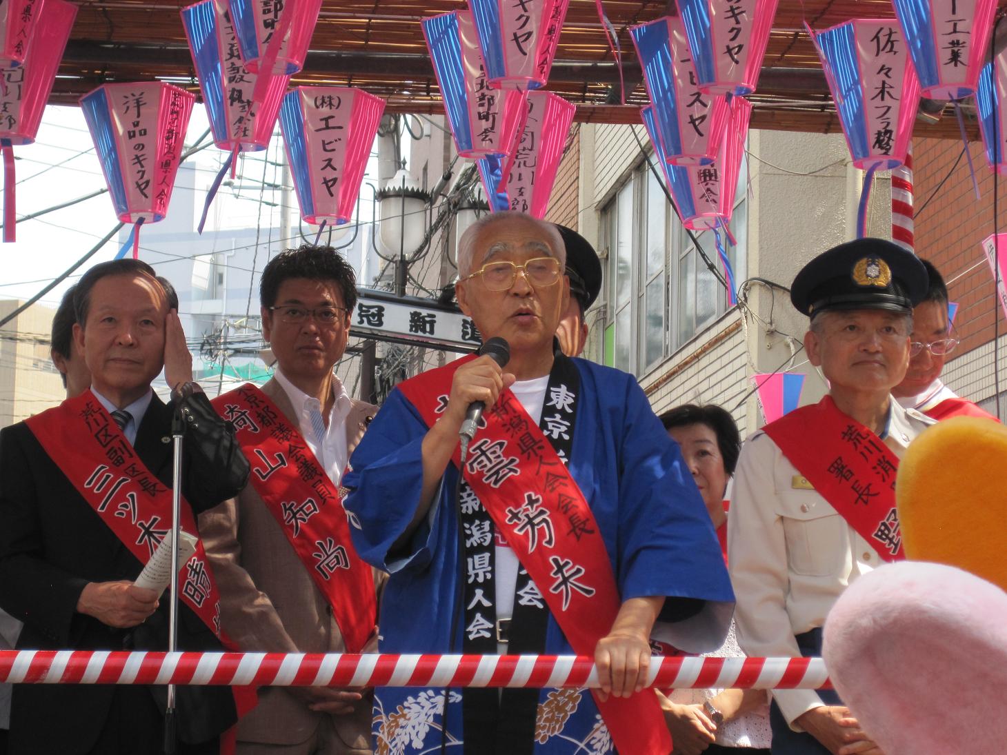 佐渡を代表する民謡として全国に知られている「佐渡おけさ」の哀調をおびた節と洗練された優雅な踊りが、約500メートルの商店街で披露されました。荒川区内を元気づけ、子どもたちにも良い思い出となるイベントを目指し、荒川区新潟県人会と冠新道商興会が主催し、平成24年から開催しています。
