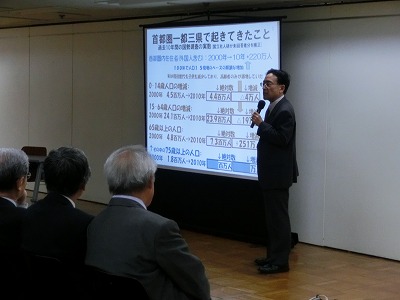 また会員懇談会後には、株式会社日本総合研究所 調査部 主任研究員の藻谷浩介氏をお招きし「中小企業は観光資源をこう活かせ!~全国の取り組みから墨田区が学ぶべきもの~」と題した特別講演会を開催しました。藻谷氏は講演の中で、現実経済の重要性を説および消費の中心となっている世代が変化していることを説明。そのうえで、その状況をしっかりととらえたマーケティングを行っていき、墨田区でしか体験できない特別なサービスを提供していくことが観光振興の成功には不可欠なことをお話されました。