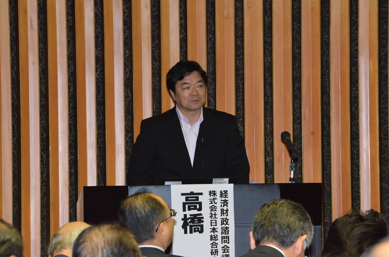 講師の経済財政諮問会議議員 株式会社日本総合研究所理事長 高橋進氏は、安倍晋三政権の経済政策における三本の矢は「対等に並んでいるのではなく、第一の矢『大胆な金融政策』と第二の矢『機動的な財政出動』は、第三の矢『新たな成長戦略』を打ち出すための環境整備と位置付けている」と紹介。