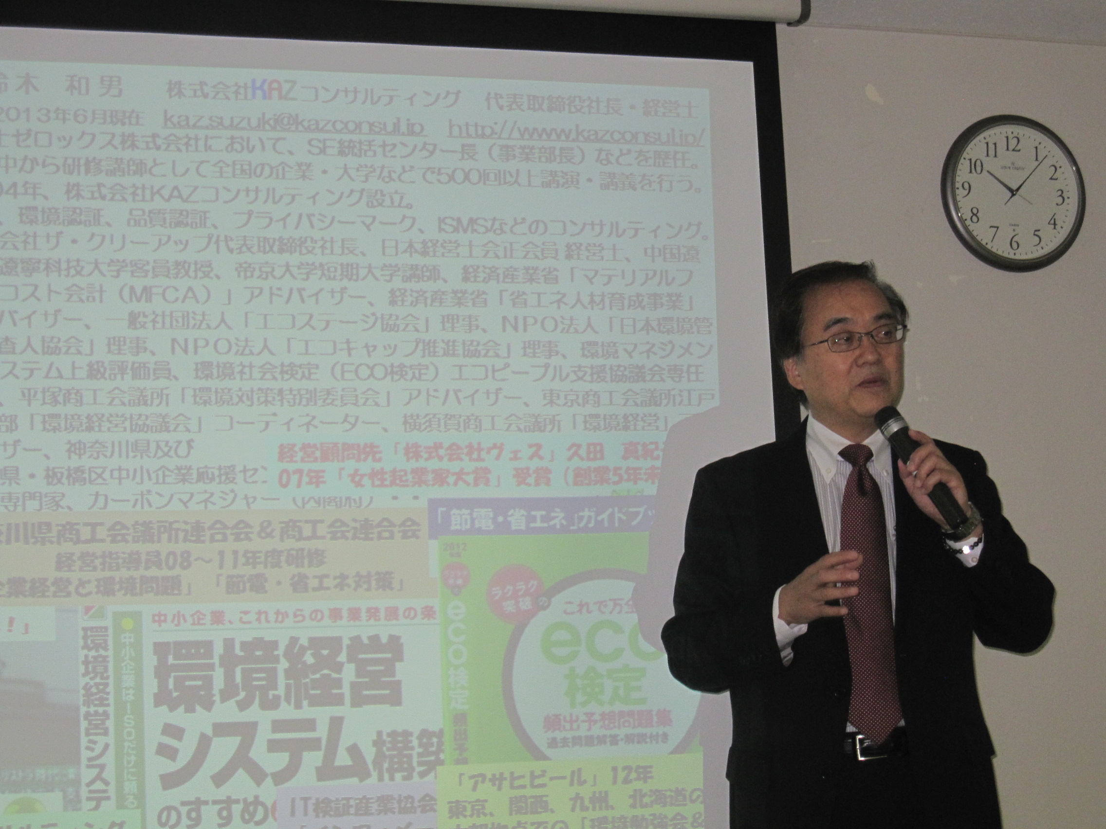 講師にエコピープル支援協議会専任講師 鈴木和男氏(㈱KAZコンサルティング代表取締役・経営士)を迎え、技術的な受験対策にとどまらず、企業の社会的責任(CSR)対応や今後のビジネスの展開に向けて活用できる内容が講義されました。