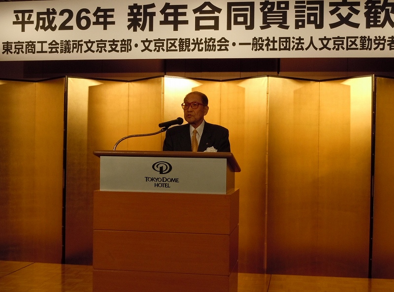 主催者挨拶で岩井会長は、アベノミクスによって大企業の収益改善が進む中、「中小企業にとっては厳しい経済環境は変わらず続いている」と説明。文京支部は今年7月に設立40周年を迎え、「中小企業に軸足を置いている東京商工会議所としては、本年も全力投球で地域経済の活性化に努力する」と挨拶いたしました。
