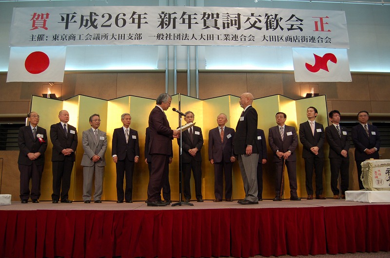 会の冒頭では、主催者を代表して浅野健・大田支部会長より本年の抱負と期待が述べられ、続けて田中常雅・副会頭(前大田支部会長)、松原忠義・大田区長、国会議員等の来賓より挨拶がありました。その後、加入年数が継続して満30年、40年、50年を迎える永年会員企業の表彰が行われ、功績を称える賞状が田中常雅・副会頭より授与されました。