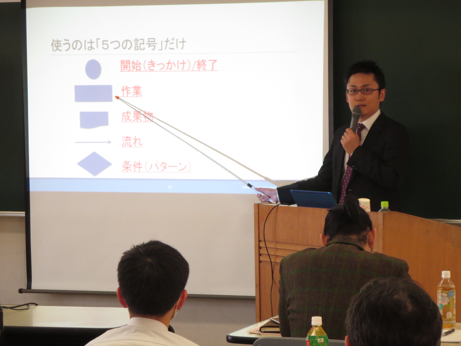 業務内容を把握整理するための「業務フロー」の考え方や、業務改善のノウハウについて解説がなされました。途中、参加者はワークを通じた自社の業務分析を行いながら受講しました。