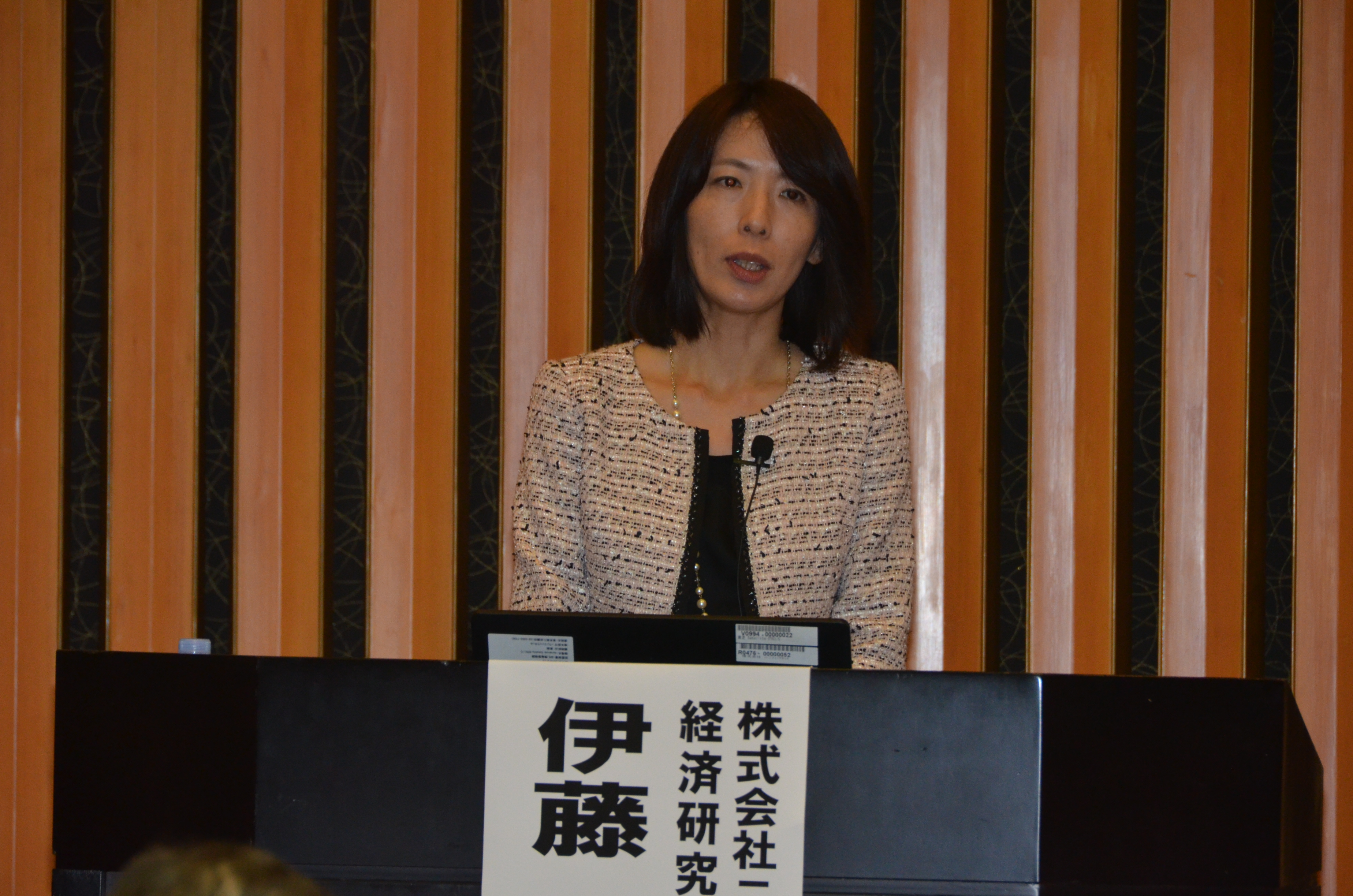 講演会で講師の株式会社ニッセイ基礎研究所 経済研究部上席研究員 伊藤さゆり氏は、日本経済見通しにつき、内需主導で回復基調を維持するとしながら、アジア諸国の成長鈍化に伴う輸出伸び悩み等による景気失速のリスクを指摘。