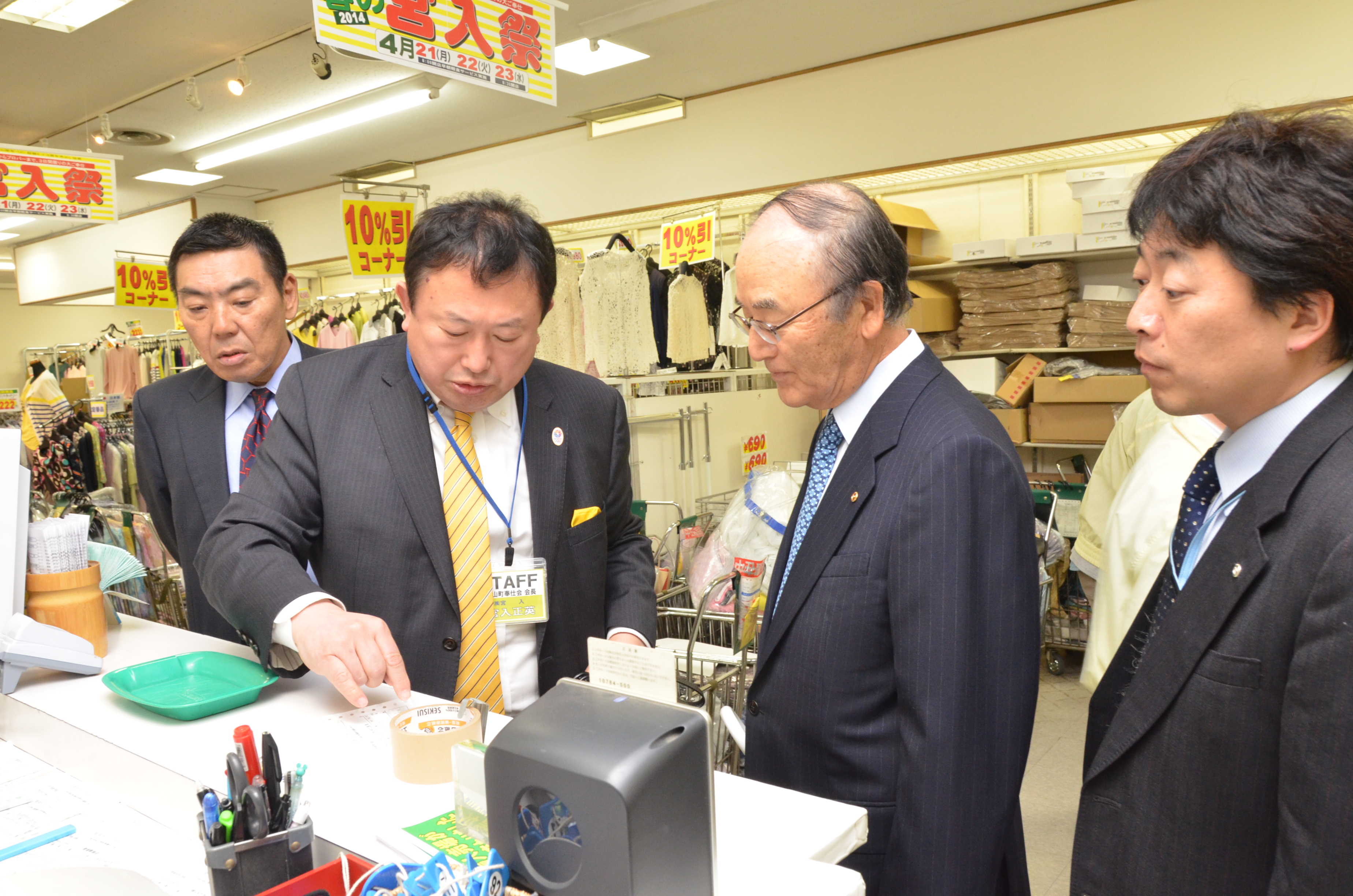 懇談に先立ち三村会頭は、中央区の横山町奉仕会(宮入正英会長・中央支部副会長)を訪問。服飾・生活雑貨などの現金問屋の集積を活性化するため、東商の仲介で文化服装学院と連携し、学生による店頭ディスプレーの展示計画の立案、同校で出張講義を行うなど連携を深めていること、また、海外バイヤー対応の中国語版地図や銀聯カード導入、Wi-Fi対応などの取組みの説明を受けました。卸売店の賑わいを紹介した宮入会長は「海外からの買付に手応えを感じている。さらなる地域ブランドの強化やインバウンドの促進が重要だ」と説明を加えました。三村会頭は「地域の力強さを感じた」と感想を述べました。