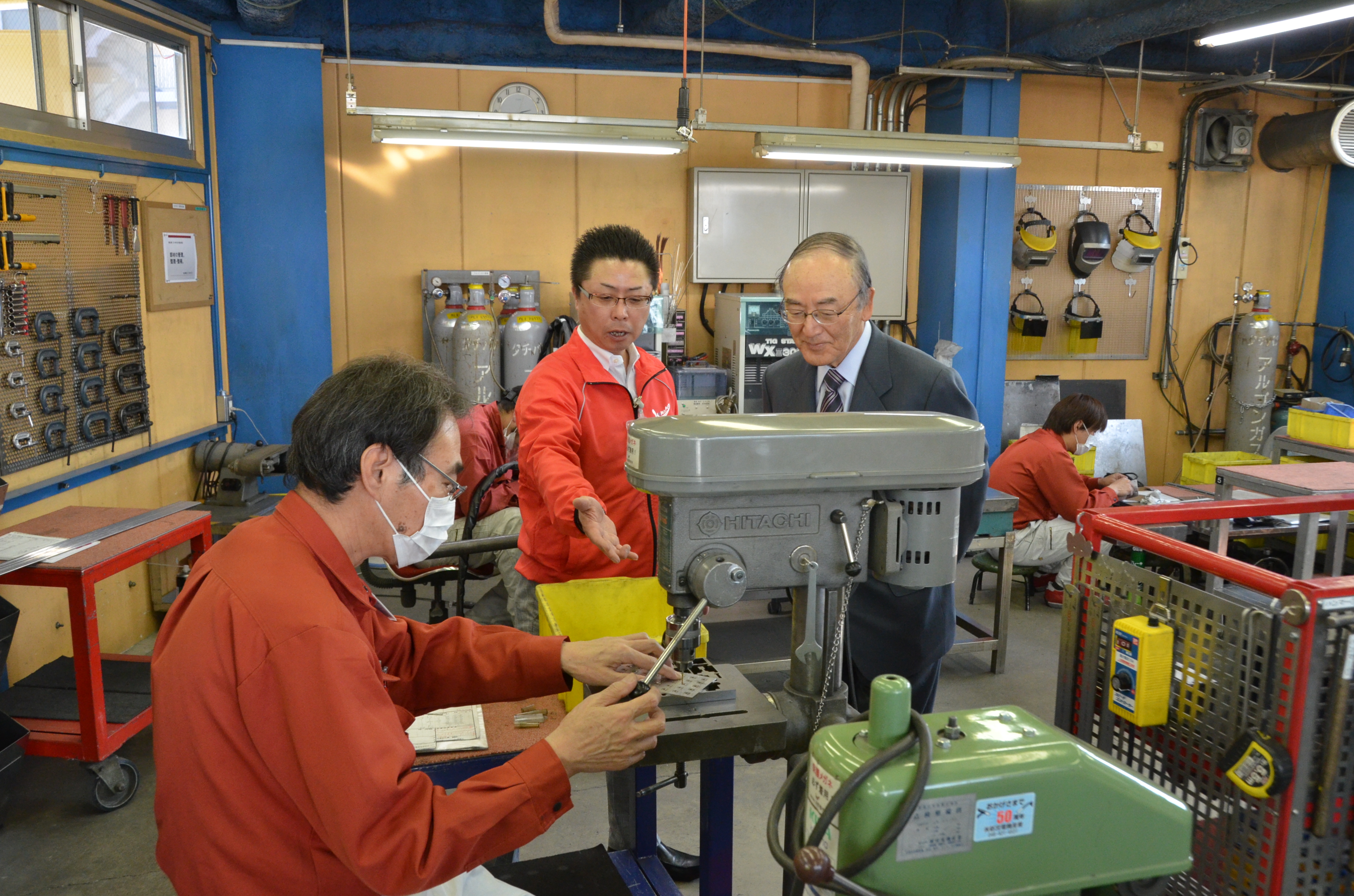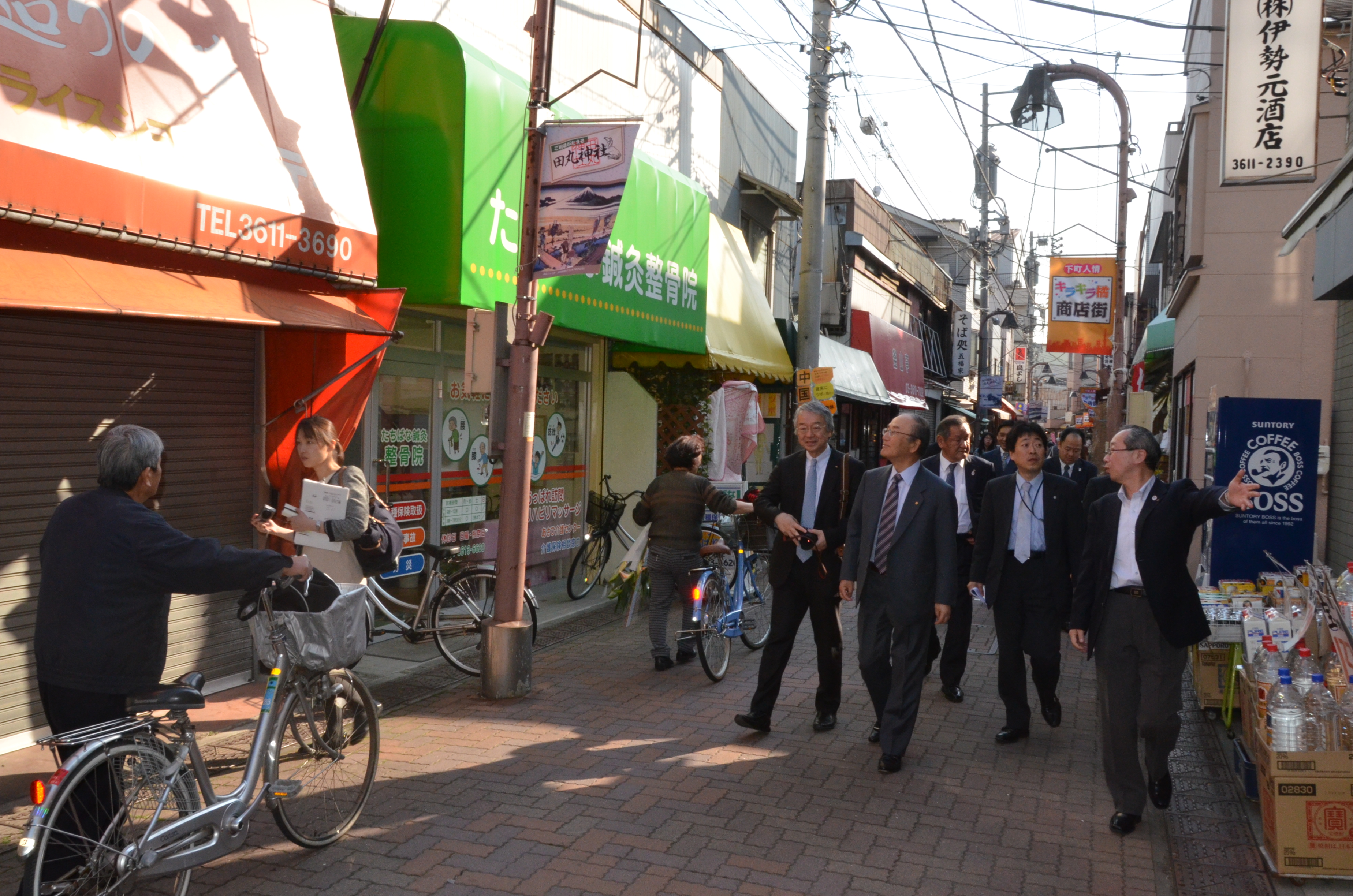 懇談会に先立ち三村会頭は、墨田区内の浜野製作所(浜野慶一社長)を訪問。板金加工や金型、ロボット製作などを行う同社の事業や、地域の学校と連携したインターンシップなどの取り組みについて説明を受けました。工場内での加工工程の視察では、浜野社長の説明に熱心に耳を傾けました。その後、墨田区内の木造密集地域や、橘銀座商店街(理事長=寺尾肇墨田支部副会長)の視察を行いました。
