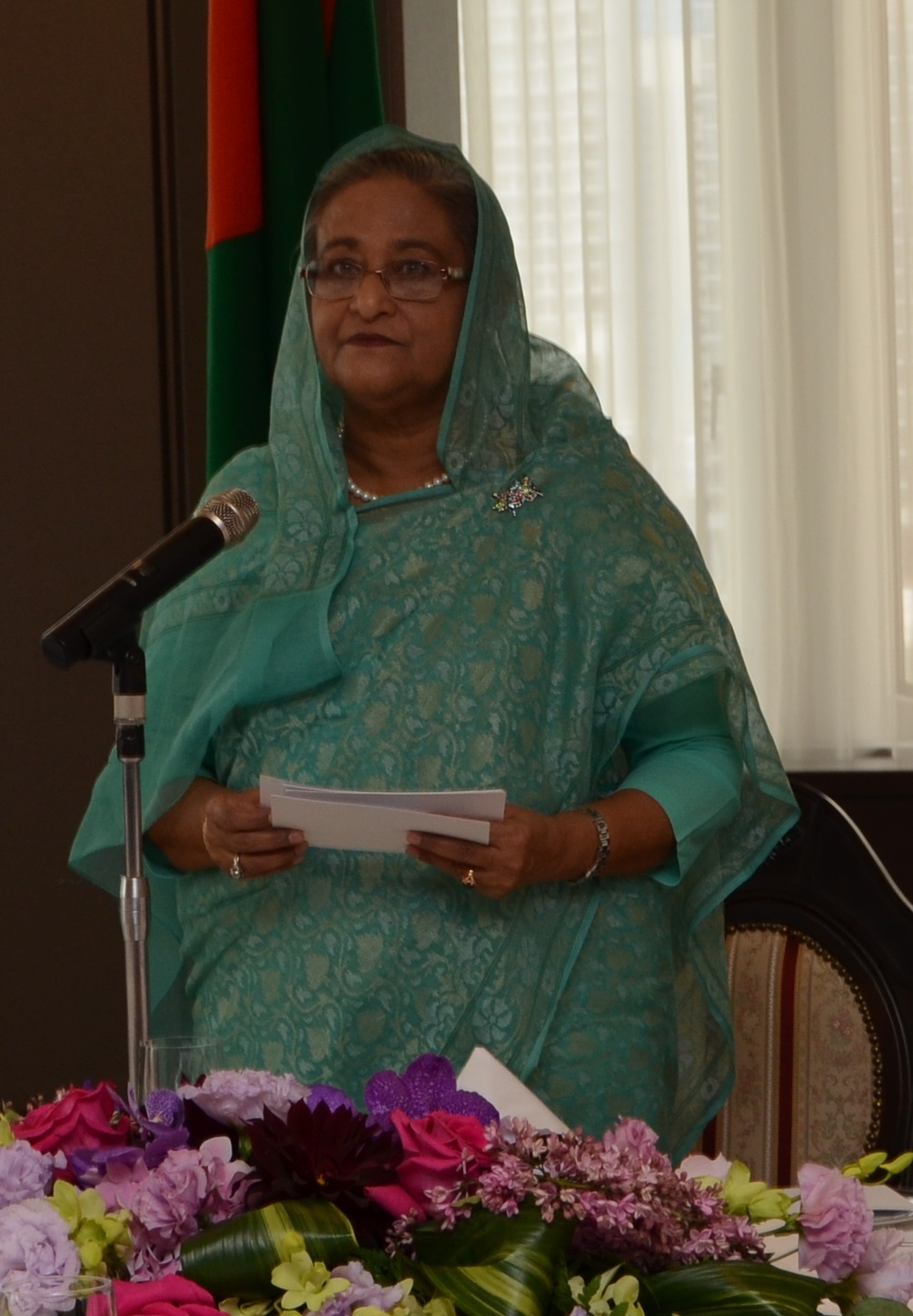 ハシナ首相は、リーマン・ショック以降も好調なバングラデシュの経済運営、政権の安定性に触れ、成長率を2017年までに10%に引き上げ、維持していくことに自信を示しました。特に、世界第2位の輸出額を誇るアパレル産業を例に挙げ、安価で競争力のある熟練労働力、リベラルな投資政策、法人税などの優遇制度、ICT環境などの比較優位性をアピールすると共に、南アジアと東南アジアの中心に位置する立地の良さについて「バングラデシュは地域経済のハブになる」と強調しました。