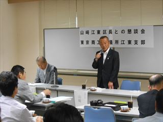 区長との懇談会では、区の東京オリンピックに向けたまちづくりや、インフラ整備、防災対策等について活発な意見交換が行われました。その後、網代江東支部会長より、山﨑江東区長へ産業振興政策に関する要望書を提出しました。