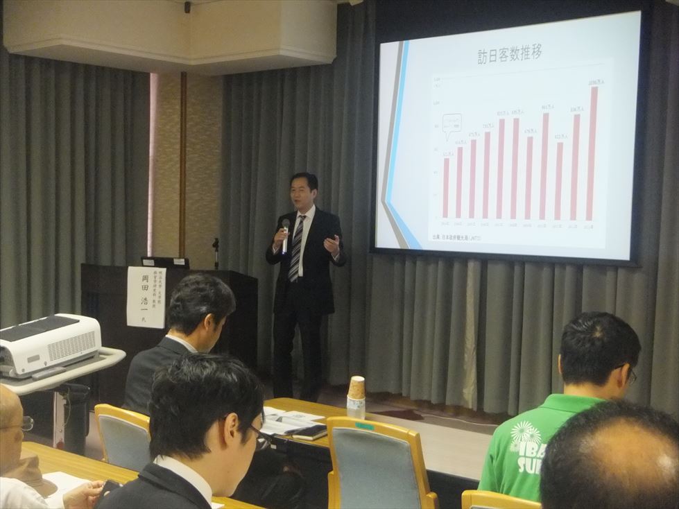 セミナーでは、まず基調講演として、明治大学大学院経営学研究科の岡田浩一教授より、インバウンドによる経済効果や、訪日外国人旅行者の特性や困りごとなどについて説明した上で、中小企業にもできるICTを活用した多言語対応や情報発信の仕組み作り等の話がありました。