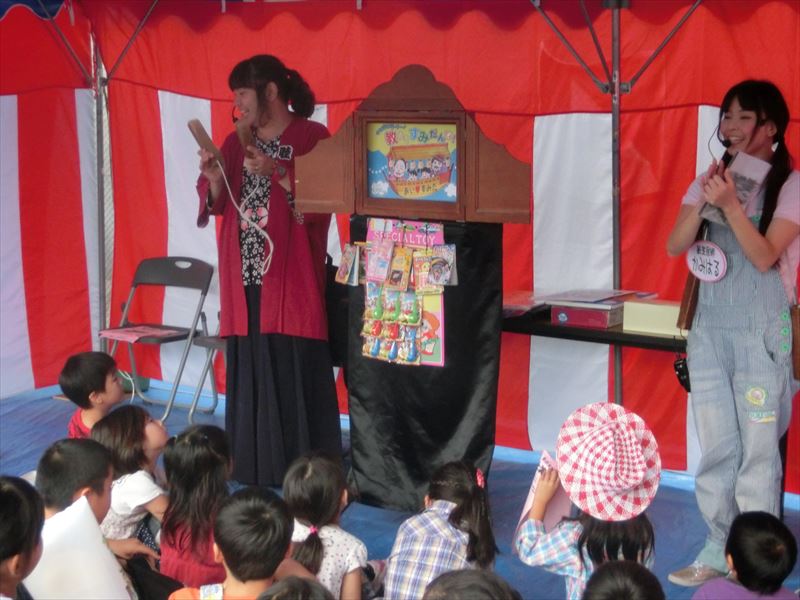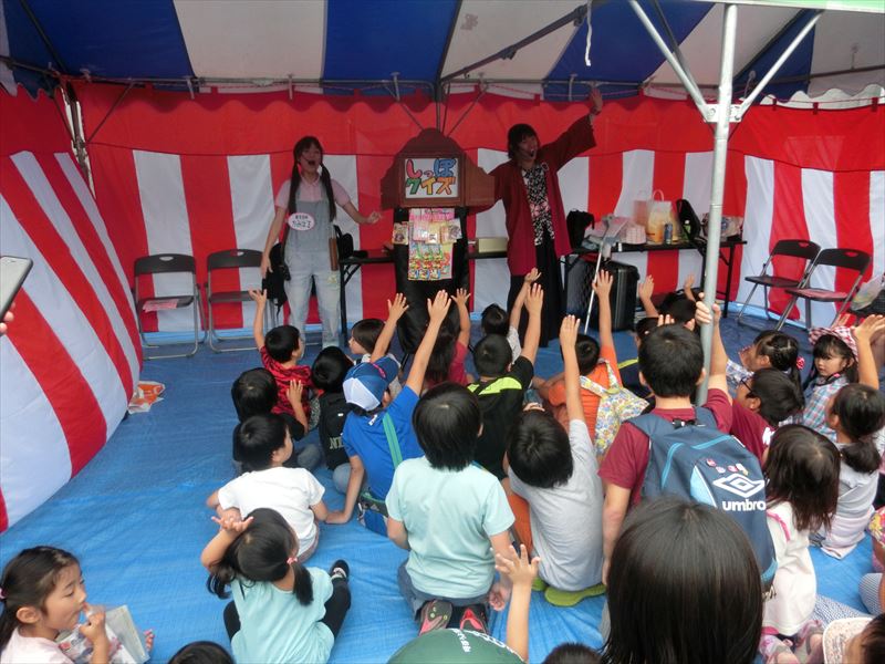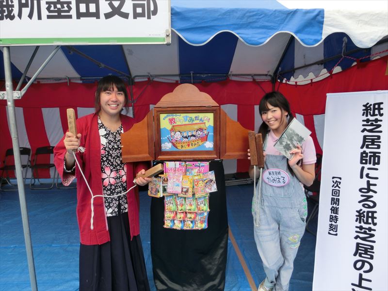 当日は、プロ紙芝居師集団である株式会社漫画家学会に所属するプロ紙芝居師の“ヤムちゃん”と“かみはる”が3回口演し、各回とも多くの子ども達が墨田支部のテントに集まり、紙芝居を楽しみました。