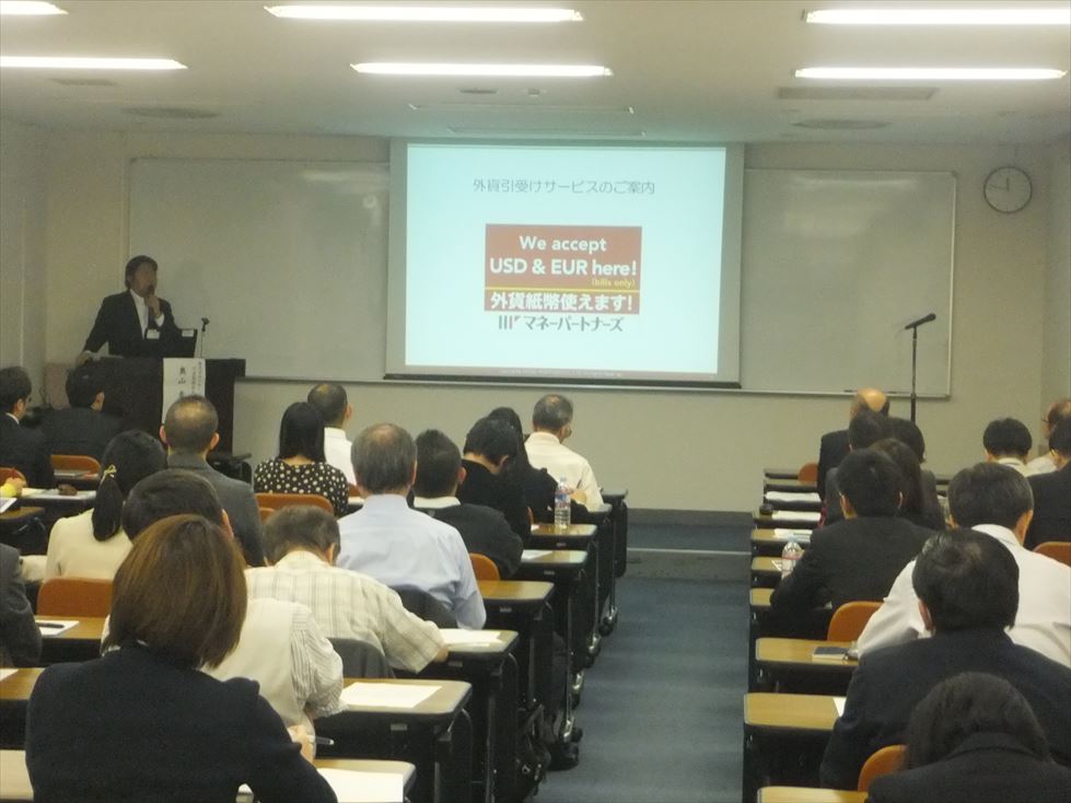 続いて、株式会社マネーパートナーズの奥山社長より、外国人旅行者が日本に求めていることや、旅行者の消費金額等の説明があった上で、小売りの原点である「お客様目線」の大切さや、お店側は外国人への「しきい」を下げる努力することなどについて話がありました。また、浅草の商店街と連携して取り組んでいる「外貨引受けサービス」の事例紹介がありました。