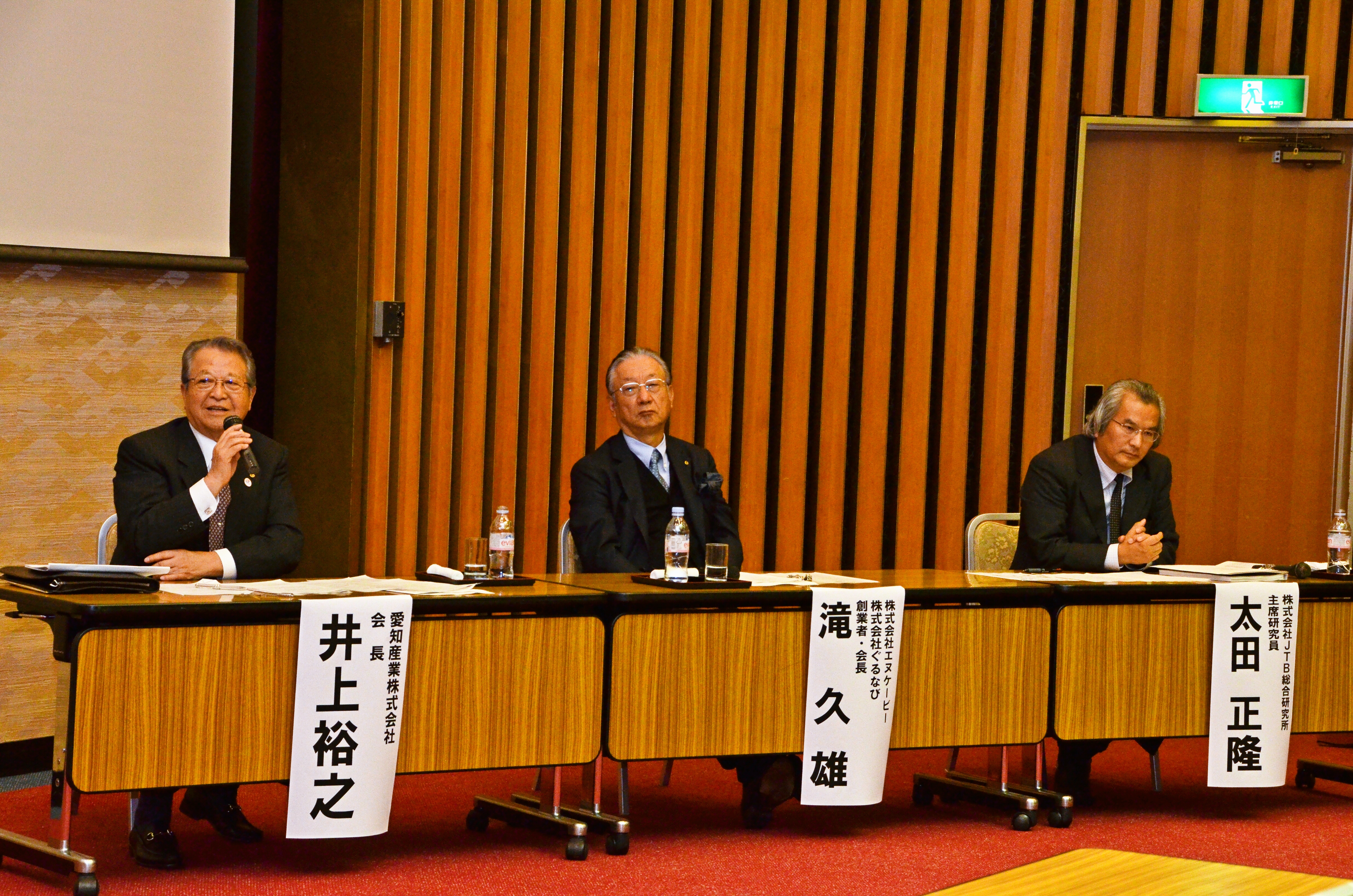 続いて、嶋中先生をコーディネータとして、愛知産業株式会社 会長 井上裕之氏、株式会社エヌケービー・株式会社ぐるなび 創業者・会長滝久雄氏、株式会社JTB総合研究所 主席研究員 太田正隆氏の3名をパネリストに迎え、パネルディスカッションを行いました。各パネリストから、各業界の景況や日本経済の課題、政府に期待する景気対策などについて活発な討論が交わされ、盛況のうちに終了しました。
