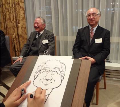 懇親会では、余興として浅草に本拠を置く似顔絵描き集団「カリカチュアジャパン」によるユニークな似顔絵の提供があり、描いてもらった本人はもちろん、描かれていく様子を眺めている人からも大きな歓声が上がっていました。