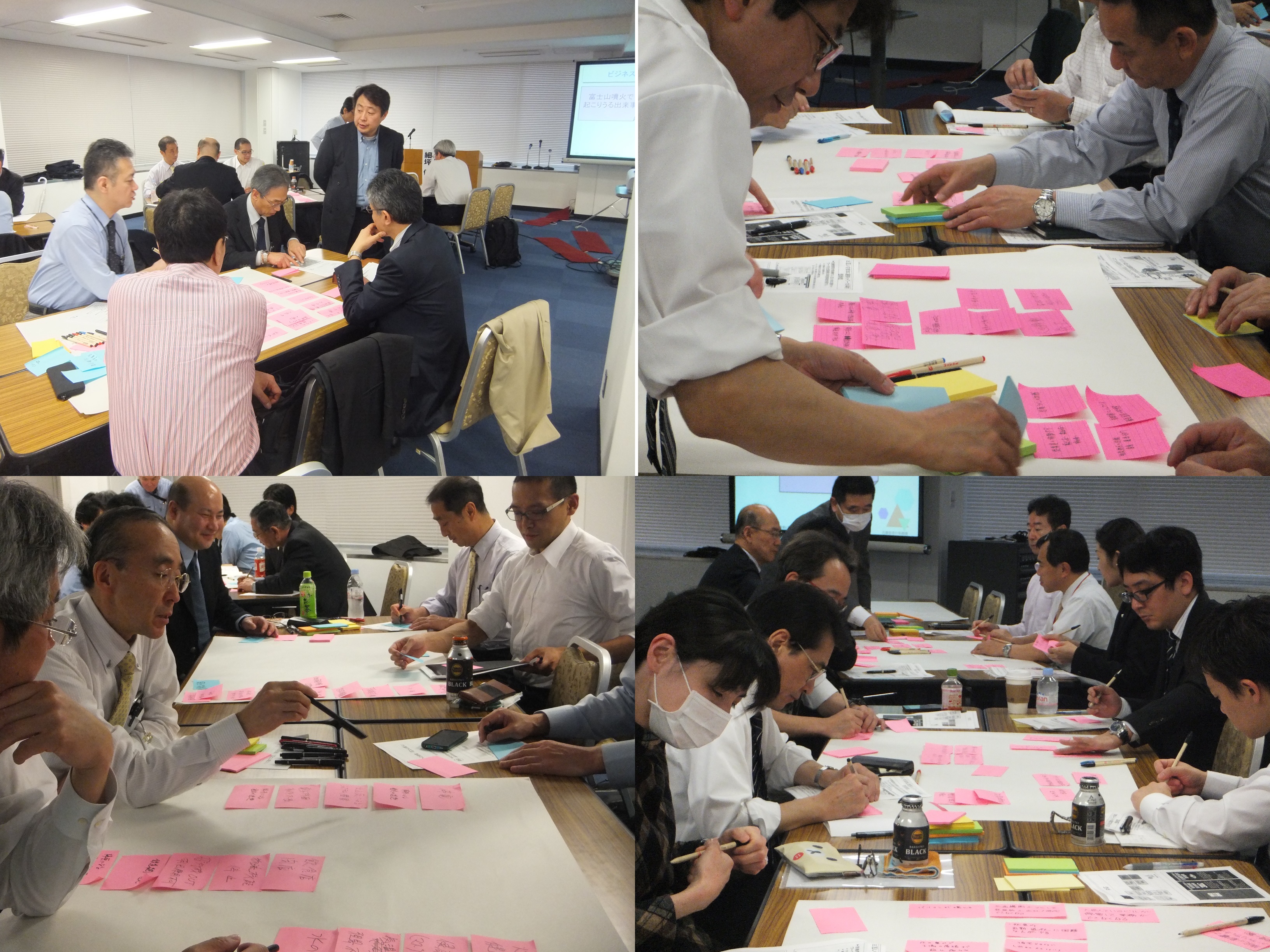 前半は、細坪氏による説明の後に、12班に分かれてワークショップを行いました。富士山噴火が起きたという想定で、富士山噴火で起こりうる出来事、ビジネスへの影響を時間軸で整理して、事業継続の考え方、方法を各班ごとで意見を出しあいました。ファシリテーターの細坪氏からは、「噴火直後のまだ電気が通っている段階の初動(1日目)の対応が重要である。また経営視点で考えることがポイントである」と説明がありました。