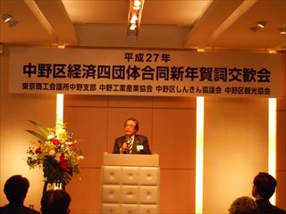 東京商工会議所中野支部(会長=麻沼雅海・アサヌマコーポレーション社長)は1月21日、west53rd日本閣にて、「平成27年中野区経済四団体合同新年賀詞交歓会」を開催しました。(共催:中野工業産業協会・中野区しんきん協議会・一般社団法人中野区観光協会)