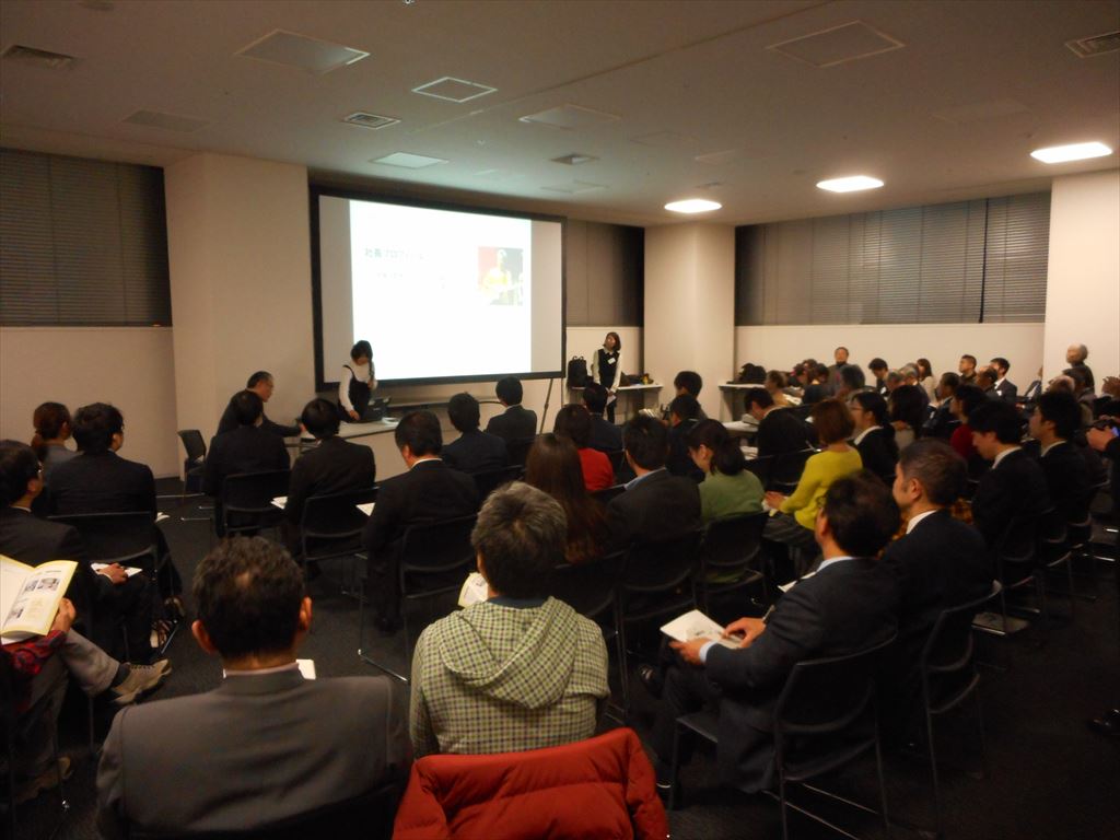 発表会には本事業参加の経営者や学生など約80人が参加。学生は自身が制作した「社長みっちゃく観察図鑑」をもとに経営者の魅力について発表しました。はじめに、本プロジェクトの監修をした友成真一早稲田大学大学院教授から、「学生と経営者では年齢や立場、人生経験も全く違う。創造的な関係を創りあげるためフラットな関係性の構築を目指した」と今回のポイントの説明がありました。