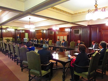 会議が開かれた会議室や、講堂などを見学しました。東商ビルでは、会頭室や副会頭応接室、経済資料センター等にて会議所の歴史資料触れたり、建築資材として貴重な大理石を見たり、屋上から皇居・丸の内・大手町を眺めたりと、建て替え前の東商ビル全体を見学しました。