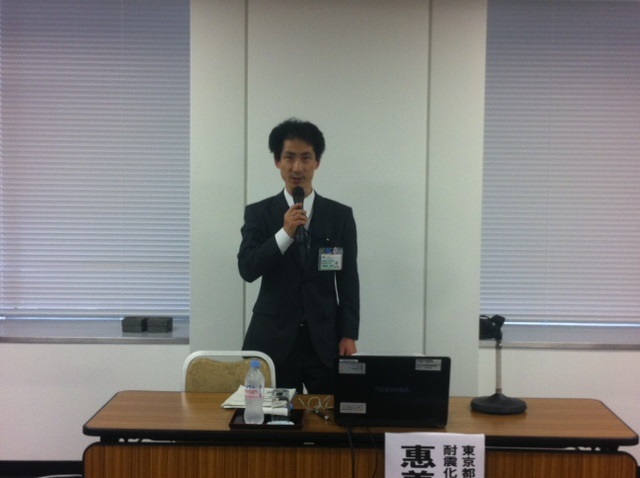 説明会では、耐震化推進に向けた東京都の施策・取り組みについて、東京都都市整備局市街地建築部耐震化推進担当課長 惠美奈 裕征 氏から、また、中小テナントビルの省エネ支援策について、公益財団法人東京都環境公社 東京都地球温暖化防止活動推進センター長 小島 正禎 氏からそれぞれご説明いただきました。