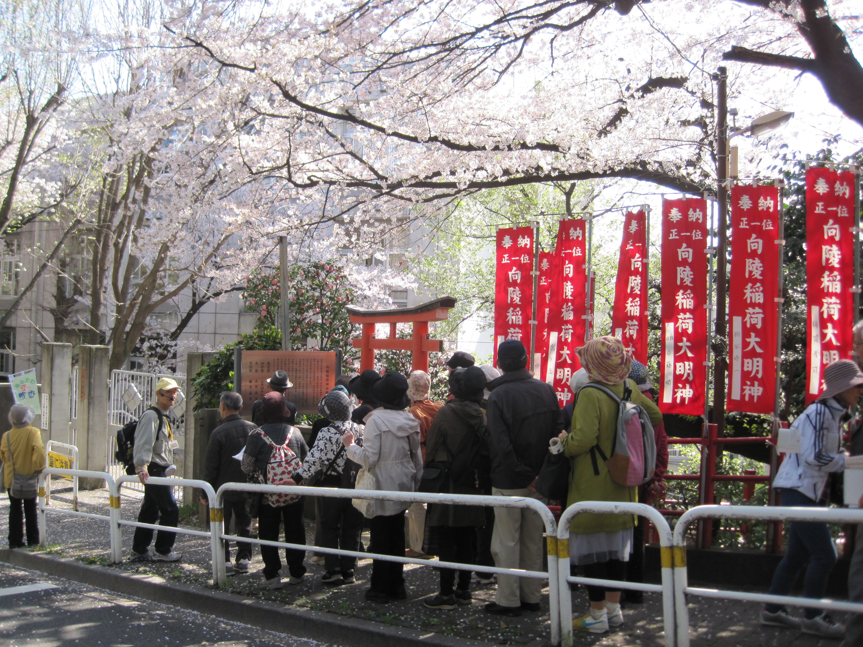 ㈲堀川鋳金所、美火土陶碗、竹工芸翠屋の荒川モノづくりスポットを見学。途中の向陵稲荷神社の桜が満開でした。その後、路地裏をてくてくと歩き「日蓮宗長明寺」から「岡倉天心記念公園」内の六角堂を巡り、「菊寿堂いせ辰」「指人形笑吉」をご案内。「指人形笑吉」では歴代総理大臣や有名人に似せた指人形に皆様感心されていました。よみせ通りの「マミーズ谷中店」でアップルパイを試食後に、谷中ぎんざをてくてく歩き「夕やけだんだん」で小休憩。最後は「茶遊亭」、「シャレースイスミニ」でご飲食・解散となりました。