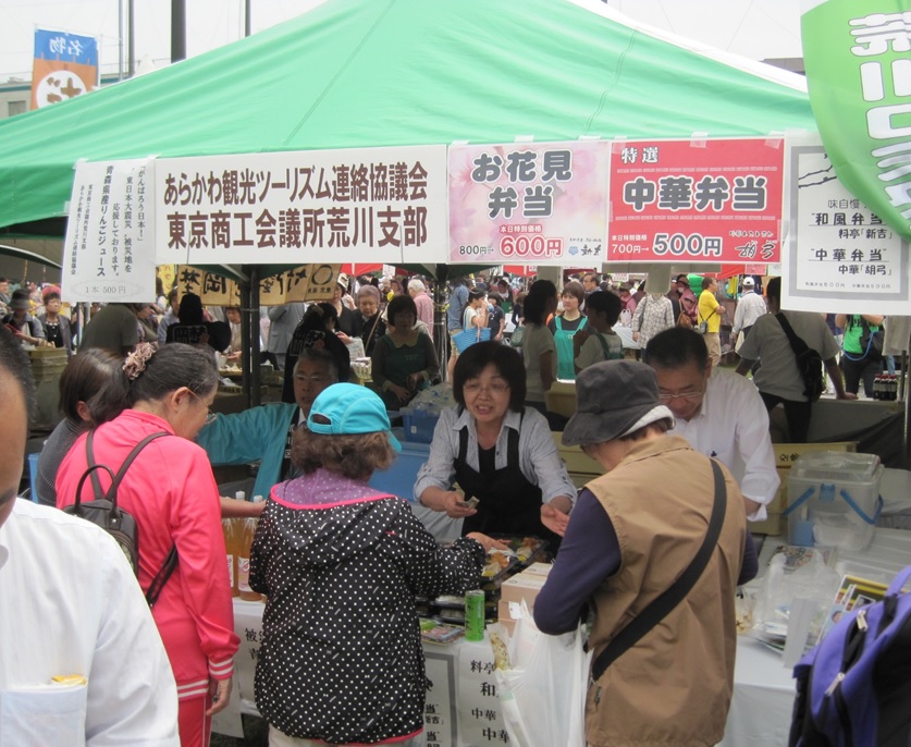 荒川支部では、荒川観光ツーリズム協議会と共同で株式会社新吉の「川の手弁当(和風)」と「中華弁当」を販売。今年も、東北支援・被災地支援事業の位置づけとして、「山下果樹園(青森県弘前市)」からりんごジュースを購入し、来場者に対して“おもてなし”として試飲していただき、ご希望の方に販売しこちらも完売となりました。